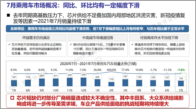 乘用車市場概況:由于去年同期高基數(shù)壓力,加上芯片供給不足、國內(nèi)局部地區(qū)洪澇災害、新冠疫情復發(fā)等因素,2021年7月銷量持續(xù)下滑。乘用車市場已連續(xù)三月同比下滑,但7月下滑幅度相比上月有所收窄,與歷年相比屬于正常水平。未來芯片短缺仍對部分廠商銷量造成較大不確定性,其中豐田系、大眾系供給端影響或?qū)⑦M一步傳導至需求端,車企產(chǎn)品供給面臨的挑戰(zhàn)短期將持續(xù)增大。