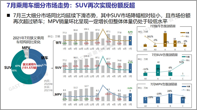 乘用車細分市場走勢:2021年7月三大細分市場同比均延續(xù)下滑態(tài)勢,其中SUV市場降幅相對較小,且市場份額再次超過轎車;MPV市場銷量環(huán)比呈現(xiàn)一定增長但整體體量仍處于較低水平。