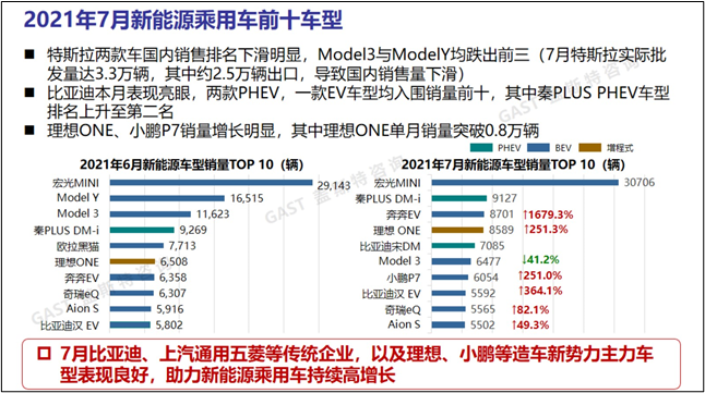7月新能源乘用車前十車型:2021年7月新能源乘用車銷量排名變化較大,比亞迪、上汽通用五菱等傳統(tǒng)企業(yè),以及理想、小鵬等造車新勢力主力車型表現(xiàn)良好,助力新能源乘用車持續(xù)高增長。本月特斯拉實際批發(fā)量達3.3萬輛,其中約2.5萬輛出口,導致國內(nèi)銷售量下滑明顯,Model 3與Model Y均跌出前三。比亞迪本月表現(xiàn)亮眼,兩款PHEV與一款EV車型均入圍銷量前十,其中秦PLUS PHEV車型排名上升至第二名。理想ONE、小鵬P7銷量增長明顯,其中理想ONE單月銷量突破0.8萬輛。
