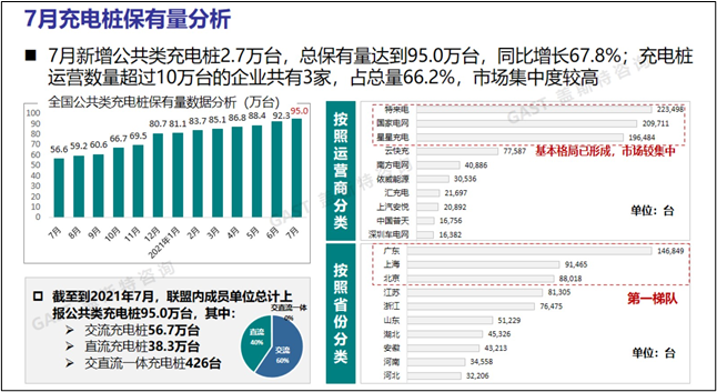 7月充電樁保有量分析:7月新增公共類充電樁2.7萬臺,總保有量達到95.0萬臺,同比增長67.8%。目前,充電樁運營數(shù)量超過10萬臺的企業(yè)共有3家,占總量的66.2%,市場集中度較高。