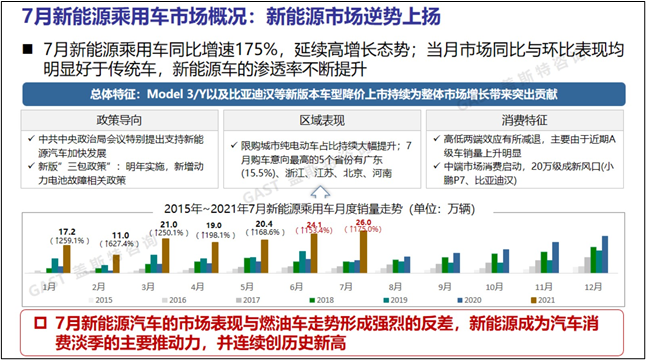 新能源汽車總體概況:2021年7月新能源汽車銷售27.1萬輛,同比增速達164.4%,延續(xù)強勁增長態(tài)勢,1-7月累計銷量已超越歷年所有年份年度銷量,增長潛力巨大。2021年1-7月新能源車總體滲透率超10%,而7月單月的滲透率已達14.5%,車市向新能源化轉(zhuǎn)型步伐提速。