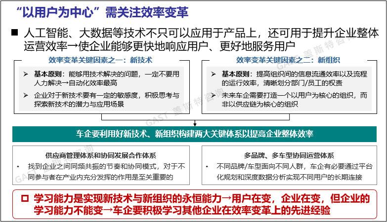 “以用戶為中心”需關(guān)注效率變革:人工智能、大數(shù)據(jù)等技術(shù)不只可以應(yīng)用于產(chǎn)品上,還可用于提升企業(yè)整體運營效率,使得企業(yè)能更快地響應(yīng)用戶、更好地服務(wù)用戶,車企要利用好新技術(shù)、新組織構(gòu)建兩大關(guān)鍵體系以提高企業(yè)整體效率,而學習能力是實現(xiàn)新技術(shù)與新組織的永恒能力,車企要積極學習其他企業(yè)在效率變革上的先進經(jīng)驗。