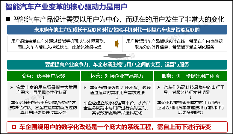 智能汽車產(chǎn)業(yè)變革的核心驅(qū)動力是用戶:智能汽車產(chǎn)品設(shè)計需要以用戶為中心,而現(xiàn)在的用戶發(fā)生了巨大的變化,未來購車的主力軍成長于互聯(lián)網(wǎng)及移動互聯(lián)網(wǎng)時代,他們期望汽車也是智能互聯(lián)的。未來,要想提高產(chǎn)業(yè)競爭力,車企必須重視與用戶之間的交互、運營與服務(wù),而以用戶為中心的數(shù)字化改造是一個龐大的系統(tǒng)工程,需自上而下進行轉(zhuǎn)變。