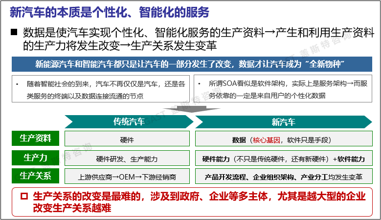 新汽車的本質(zhì):是個性化、智能化的服務(wù),新能源汽車和智能汽車都只是讓汽車的一部分發(fā)生了改變,只有數(shù)據(jù)才讓汽車成為“全新物種”,數(shù)據(jù)是使汽車實現(xiàn)個性化、智能化的生產(chǎn)資料。由于產(chǎn)生和利用生產(chǎn)資料的生產(chǎn)力將發(fā)生改變,因此生產(chǎn)關(guān)系也必須發(fā)生變革,而生產(chǎn)關(guān)系的變革是最難的,涉及到政府、企業(yè)等多主體,越大的企業(yè)改變生產(chǎn)關(guān)系越艱難。