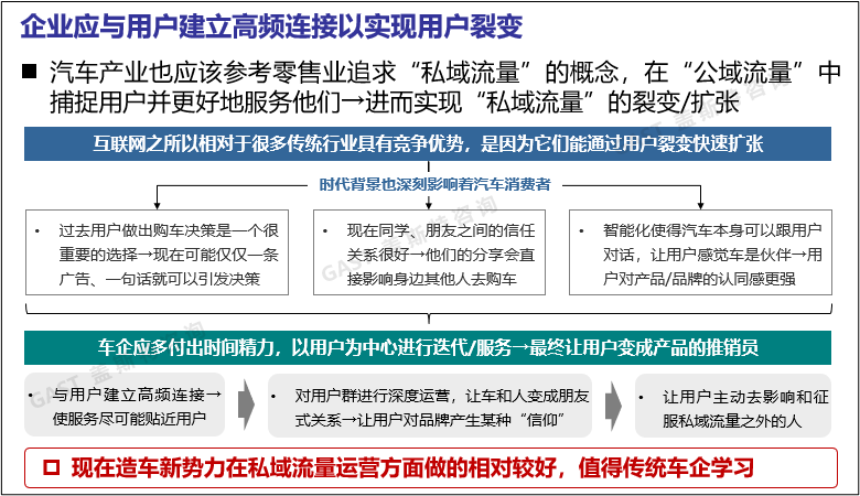 企業(yè)應(yīng)與用戶建立高頻連接以實現(xiàn)用戶的裂變:汽車產(chǎn)業(yè)也應(yīng)參考零售業(yè)追求“私域流量”的概念,在“公域流量”中捕捉用戶并對用戶進行更好的服務(wù),進而實現(xiàn)“私域流量”的裂變或擴張,在私域流量運營方面,傳統(tǒng)車企更應(yīng)向造車新勢力學習。