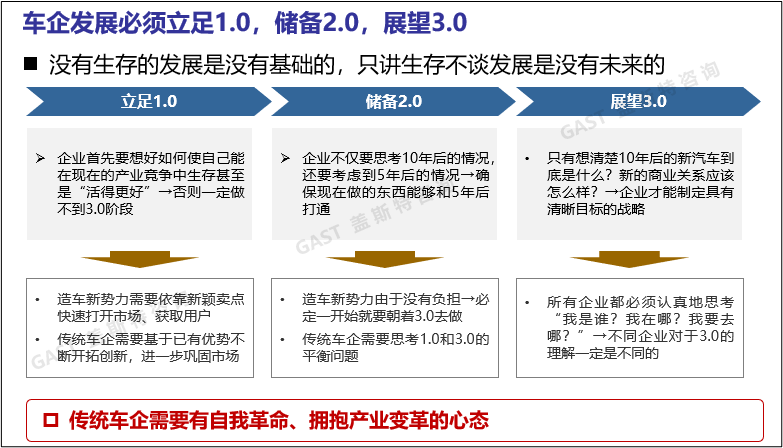 車企發(fā)展必須立足1.0,儲備2.0,展望3.0:沒有生存的發(fā)展是沒有基礎(chǔ)的,只講生存不談發(fā)展是沒有未來的,傳統(tǒng)車企需要有自我革命、擁抱產(chǎn)業(yè)變革的心態(tài)。