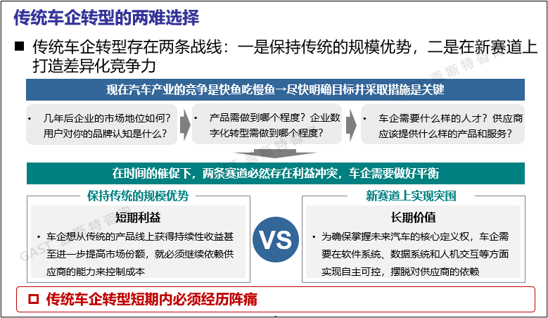 傳統(tǒng)車企轉(zhuǎn)型的兩難選擇:傳統(tǒng)車企轉(zhuǎn)型存在兩條戰(zhàn)線,一是保持傳統(tǒng)的規(guī)模優(yōu)勢,二是在新賽道上打造差異化競爭力,現(xiàn)在汽車產(chǎn)業(yè)的競爭是快魚吃慢魚,在時間的催促下,兩條賽道必然存在利益沖突,需要企業(yè)盡快明確目標并采取措施。傳統(tǒng)車企向新賽道轉(zhuǎn)型,短期內(nèi)必須經(jīng)歷陣痛。