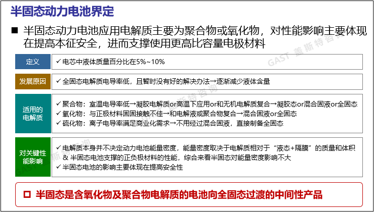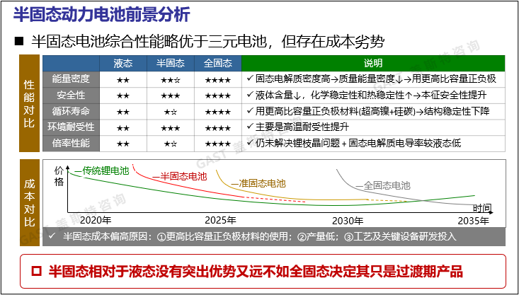 長期看半固態(tài)電池只是過渡產(chǎn)品:半固態(tài)電池相對于現(xiàn)有材料體系優(yōu)勢不夠突出,長期而言在各方面的性能及降本潛力不如全固態(tài)電池,這決定了半固態(tài)電池不會成為具有長久、旺盛生命力的主流電池體系,而只是現(xiàn)有體系向全固態(tài)電池過渡的中間產(chǎn)品。