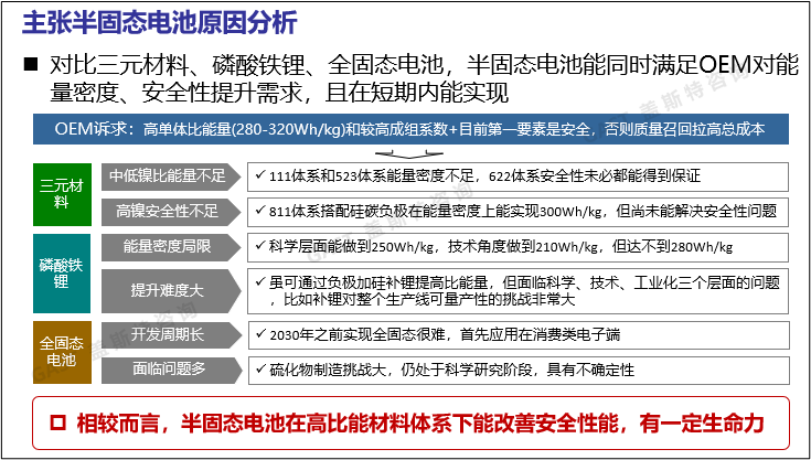 半固態(tài)電池短期內(nèi)能滿足OEM訴求:OEM要求動力電池同時具備高單體比能量(280~320Wh/Kg)和高安全性。而三元材料中的中\(zhòng)低鎳三元比能量達不符合要求,高鎳三元的安全性問題尚未得到解決;磷酸鐵鋰電池在能量密度方面存在局限,科學層面僅能達到250Wh/Kg;全固態(tài)電池的開發(fā)周期太長,且其中最具性能優(yōu)勢的硫化物尚處于科學研究階段,前景有不確定性;對比而言,半固態(tài)電池能同時滿足OEM對比能量和安全性的要求,因此有一定生命力。