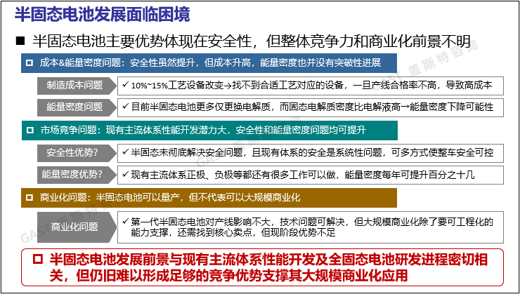 因整體競爭力不突出半固態(tài)電池發(fā)展面臨困境:半固態(tài)電池雖然安全性和能量密度得以提升,但并不是突破性進展,且現(xiàn)有主流體系在這兩方面尚有較大的開發(fā)潛力。此外,半固態(tài)電池的大規(guī)模商業(yè)化還需要找到核心賣點,而半固態(tài)電池現(xiàn)階段的優(yōu)勢尚不足以形成支撐。