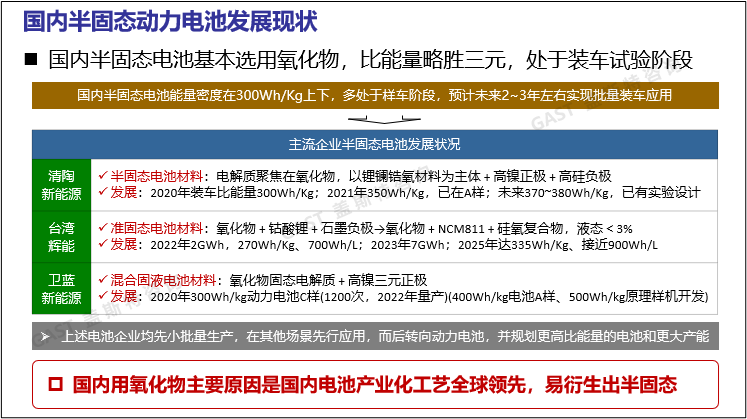 半固態(tài)電池短期內(nèi)可實現(xiàn)批量裝車應用:國內(nèi)半固態(tài)電池的電解質(zhì)多選用氧化物,能量密度目前可達到300Wh/Kg,主流電池企業(yè)已能小批量生產(chǎn)并實現(xiàn)了在其他場景上的應用,但汽車上多處于樣車階段,預計未來2~3年可實現(xiàn)批量裝車應用。