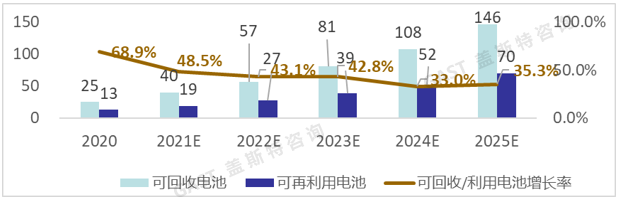 蓋斯特戰(zhàn)略咨詢團(tuán)隊(duì)通過對電動(dòng)車市場規(guī)模、應(yīng)用場景、電池壽命以及電池供應(yīng)量等影響因素的研究和分析,形成了動(dòng)力電池回收規(guī)模的預(yù)測模型,預(yù)測結(jié)果包括未來五年的電池退役量以及相應(yīng)的回收/利用增長率,詳見圖1。根據(jù)預(yù)測結(jié)果,到2025年我國可回收電池規(guī)模將接近150GWh,回收再利用的市場規(guī)模值得期待。因而相關(guān)企業(yè)如何抓住未來電池回收的發(fā)展機(jī)會(huì)、制定清晰的戰(zhàn)略布局以及可操作的實(shí)施方案變得極為重要。