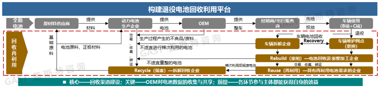 蓋斯特戰(zhàn)略咨詢團(tuán)隊(duì)根據(jù)動(dòng)力電池在全生命周期內(nèi)的應(yīng)用與流動(dòng)方式,梳理了動(dòng)力電池從原材料制造、使用、回收、重組、再利用以及到最后的報(bào)廢等方面的細(xì)節(jié),并基于此提出退役電池回收利用平臺(tái)思路(如圖2所示)。從整個(gè)產(chǎn)業(yè)鏈來看,退役電池能夠?qū)崿F(xiàn)有效回收利用的前提是各環(huán)節(jié)參與主體都能獲得自身的效益,其中的關(guān)鍵在于車企對電池?cái)?shù)據(jù)的收集與共享,構(gòu)建平臺(tái)的核心任務(wù)是建設(shè)回收渠道。