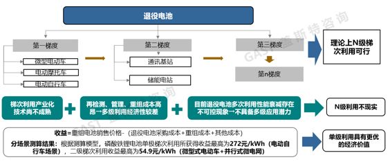 從理論上講,退役電池可以進(jìn)行多級梯次利用,把價(jià)值發(fā)揮到極致,但是經(jīng)過綜合效益分析,多級利用并非最佳方案。
