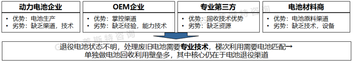 在動(dòng)力電池全生命周期中,參與方包括動(dòng)力電池企業(yè)、整車企業(yè)、專業(yè)第三方回收企業(yè)、電池材料商等,各參與方具備的優(yōu)劣勢各有不同,但是誰控制電池生命周期狀態(tài),誰的話語權(quán)就強(qiáng),其核心仍在于電池退役渠道,具體參見圖8。綜合來看,整車企業(yè)在電池回收產(chǎn)業(yè)鏈中起著決定性作用。