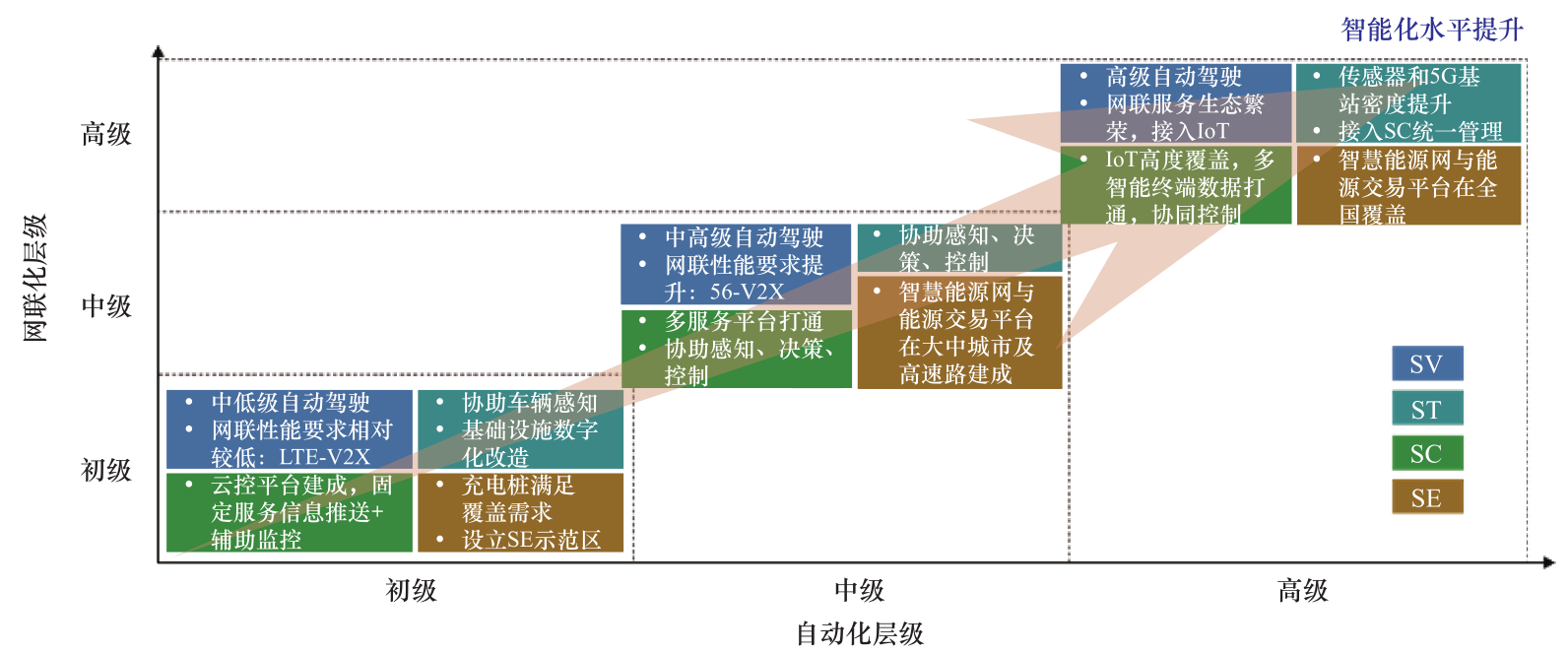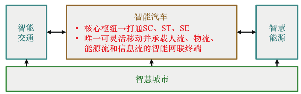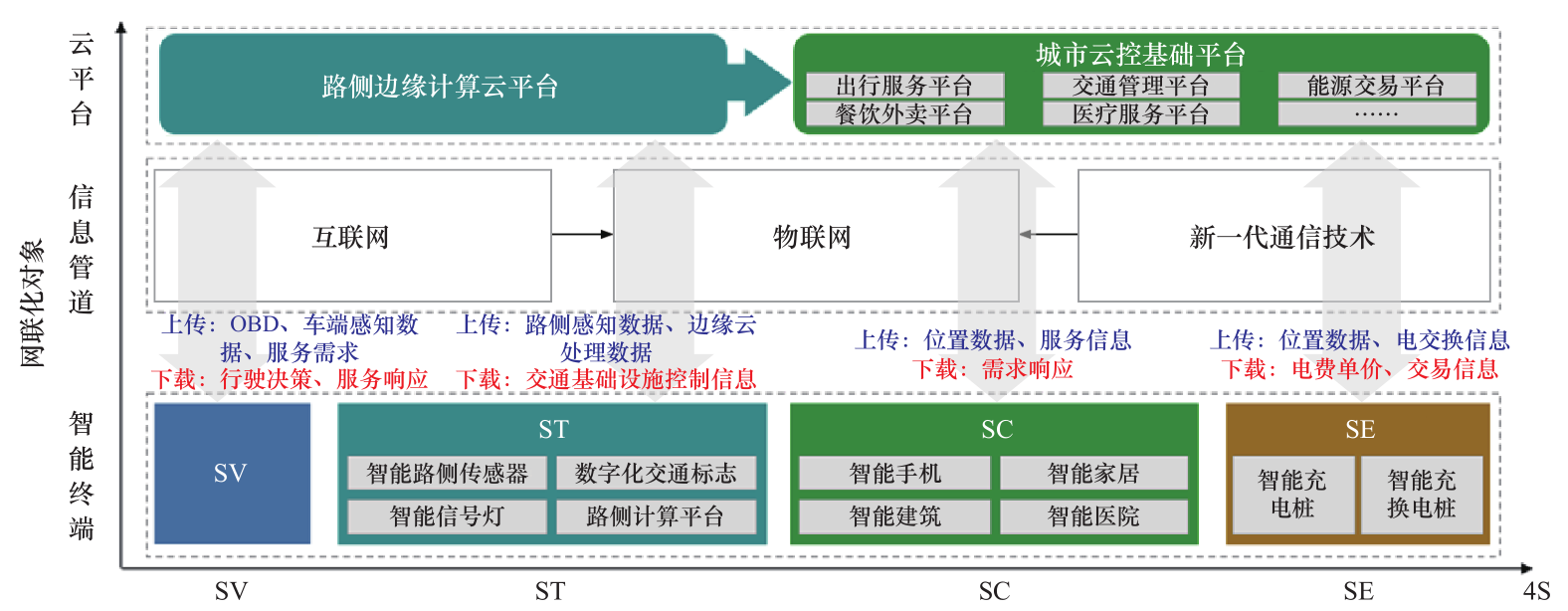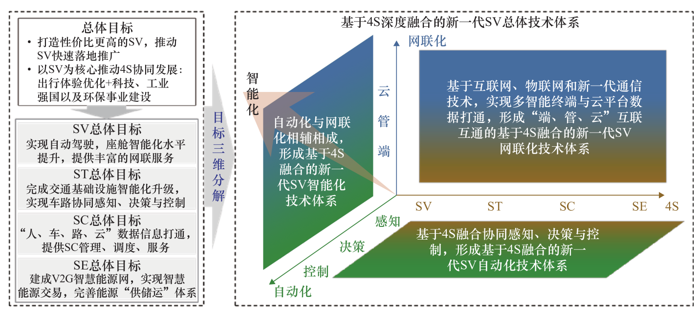 已有研究較多關(guān)注 SV 或智能道路的若干單項(xiàng)、單類技術(shù),而站位于 4S 協(xié)同融合的層次開展 SV 發(fā)展研究較為缺乏。針對(duì)于此,本文創(chuàng)新性地提出基于 4S 融合的新一代 SV 概念:與 ST、SC、SE 互聯(lián)互通,實(shí)現(xiàn)“人、車、路、云”協(xié)同感知、決策與控制,連接豐富的外部服務(wù)生態(tài);在宏觀層面開展較為系統(tǒng)的研究,在促進(jìn) SV 與其余 3S 協(xié)同融合發(fā)展的基礎(chǔ)上,為城市智能化建設(shè)、國家能源網(wǎng)絡(luò)清潔化、智能化轉(zhuǎn)型提供啟發(fā)與借鑒。