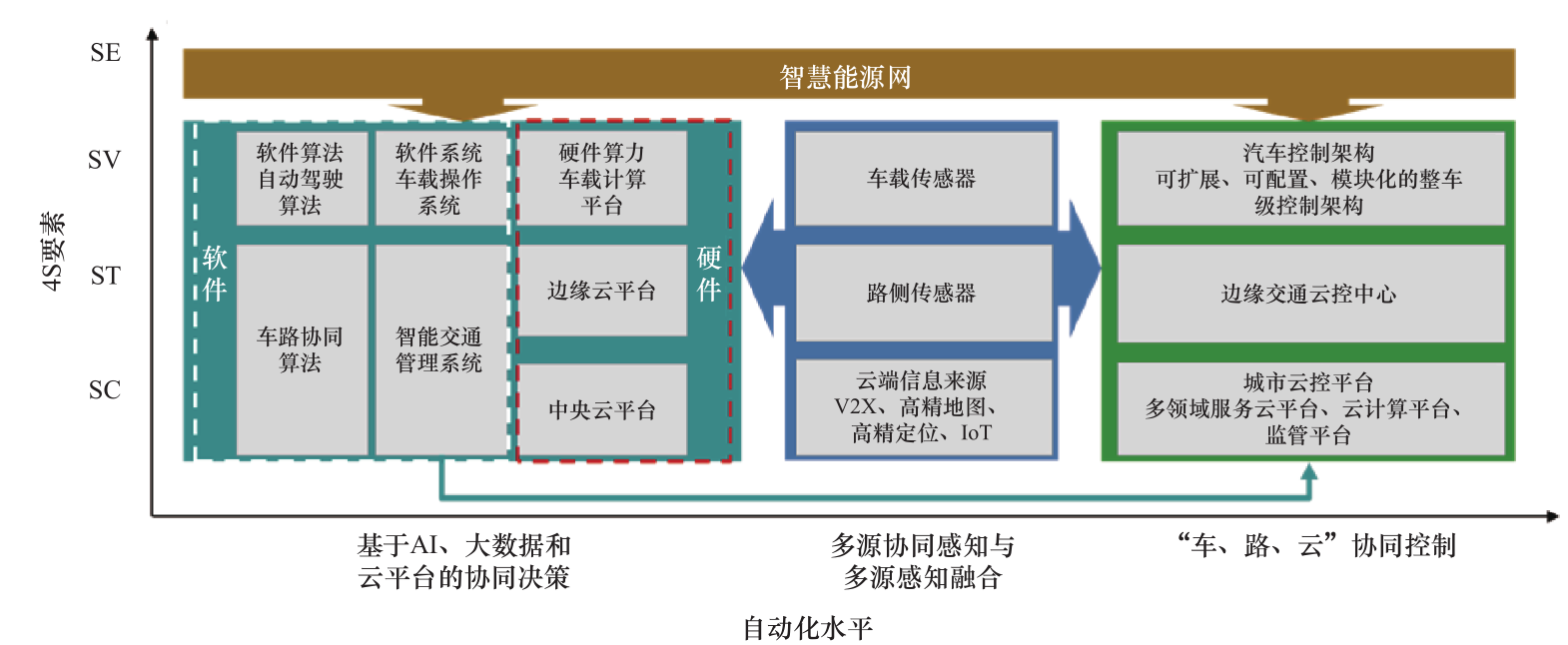 在硬件層面,SV 基于車載計(jì)算平臺(tái),ST、SC 基于邊緣云平臺(tái)和“中央城市大腦”,通過高速率、低時(shí)延、大帶寬的新一代通信技術(shù)實(shí)現(xiàn)資源共享,共同處理多源協(xié)同感知獲得的龐大數(shù)據(jù),為車端、路側(cè)基礎(chǔ)設(shè)施及 SC 參與者提供決策支撐。在系統(tǒng)層面,“車、路、云”系統(tǒng)均需預(yù)留標(biāo)準(zhǔn)接口以支持 4S 系統(tǒng)連通,車端自動(dòng)駕駛算法與路端車路協(xié)同算法、信號(hào)優(yōu)化算法不斷協(xié)同優(yōu)化,共同提升車輛乃至 4S 的自動(dòng)化水平。