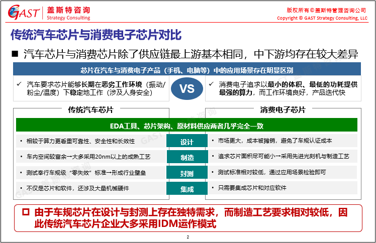 傳統(tǒng)汽車(chē)芯片與消費(fèi)電子芯片的異同:汽車(chē)芯片與消費(fèi)電子芯片在供應(yīng)鏈上游環(huán)節(jié)基本一致,但由于應(yīng)用場(chǎng)景的差異,兩者在中下游的設(shè)計(jì)、制造、封裝、集成環(huán)節(jié)均存在較大差別。