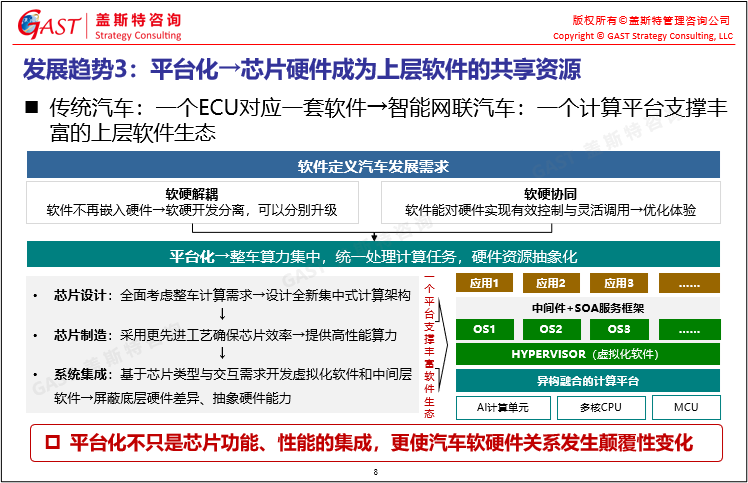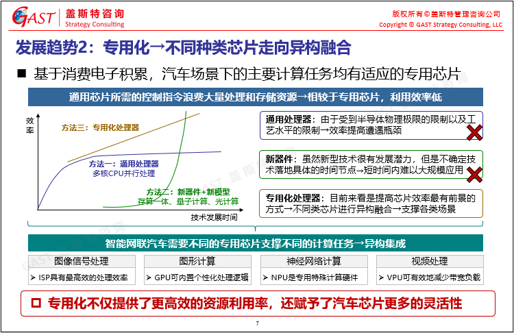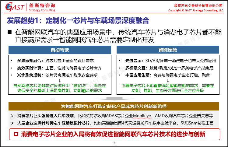 智能網(wǎng)聯(lián)汽車(chē)芯片的發(fā)展趨勢(shì):①定制化開(kāi)發(fā),芯片與車(chē)載場(chǎng)景深度融合;②專(zhuān)用化,不同種類(lèi)芯片走向異構(gòu)融合;③平臺(tái)化,芯片硬件成為上層軟件的共享資源。