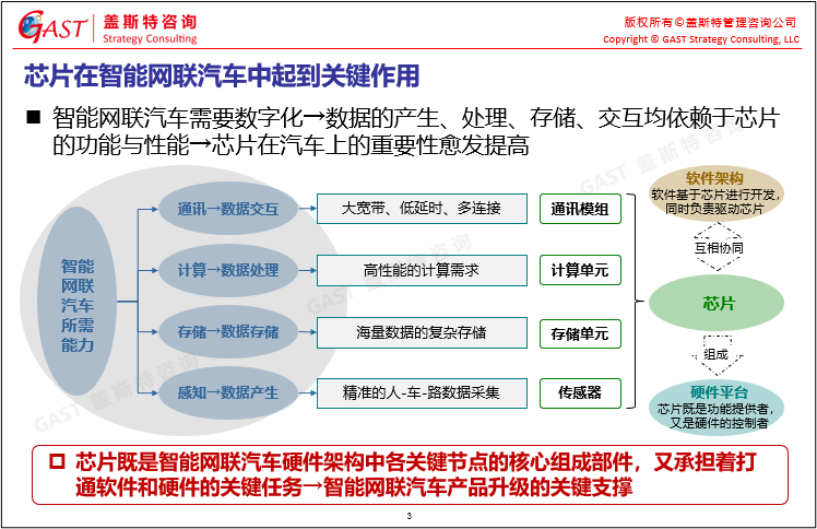 芯片在智能網(wǎng)聯(lián)汽車(chē)中的關(guān)鍵作用:數(shù)據(jù)作為智能網(wǎng)聯(lián)汽車(chē)的核心要素,其產(chǎn)生、處理、存儲(chǔ)、交互均依賴(lài)芯片的功能與性能,因此,芯片在汽車(chē)上的重要性愈發(fā)提高。芯片既是智能網(wǎng)聯(lián)汽車(chē)硬件架構(gòu)中各關(guān)鍵節(jié)點(diǎn)的核心部件,又承擔(dān)著打通軟件和硬件的關(guān)鍵任務(wù),是智能網(wǎng)聯(lián)汽車(chē)產(chǎn)品升級(jí)的關(guān)鍵支撐。