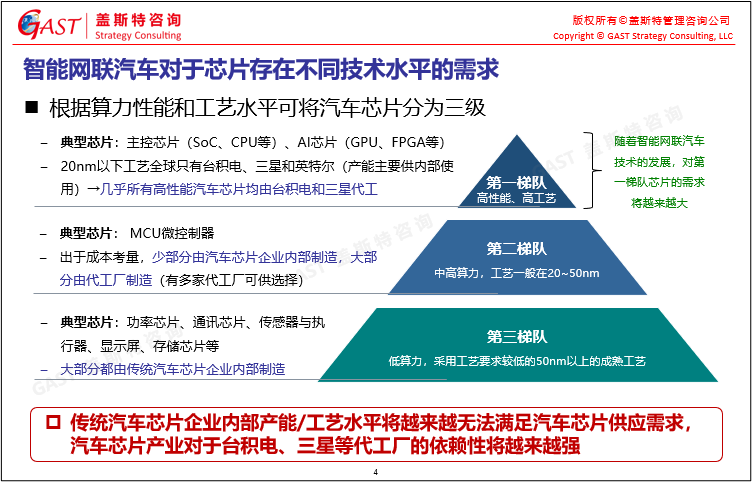 智能網(wǎng)聯(lián)汽車(chē)芯片分類(lèi):根據(jù)算力性能和工藝水平可將汽車(chē)芯片分為三級(jí),第一梯隊(duì)為高性能、高工藝芯片,第二梯隊(duì)為中高算力芯片,第三梯隊(duì)為低算力芯片。