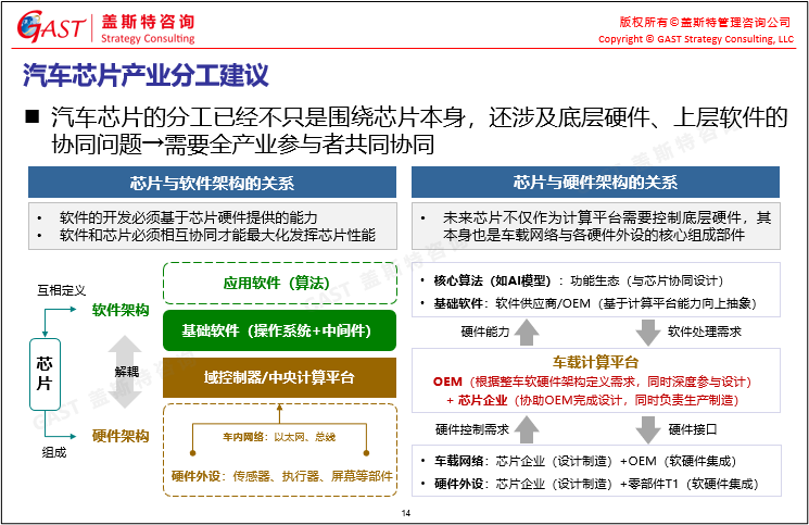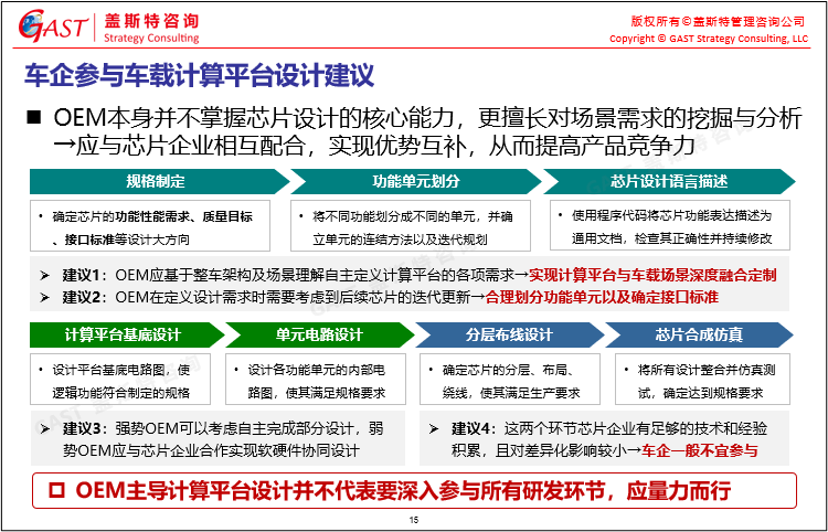 汽車(chē)產(chǎn)業(yè)芯片發(fā)展建議:①產(chǎn)業(yè)分工:不只圍繞芯片本身,還涉及底層硬件、上層軟件的協(xié)同問(wèn)題,需要全產(chǎn)業(yè)參與者共同協(xié)同;②車(chē)企參與車(chē)載計(jì)算平臺(tái)設(shè)計(jì):OEM本身并不掌握芯片設(shè)計(jì)的核心能力,更擅長(zhǎng)對(duì)場(chǎng)景需求的挖掘與分析,應(yīng)與芯片企業(yè)相互配合,實(shí)現(xiàn)優(yōu)勢(shì)互補(bǔ),從而提高產(chǎn)品競(jìng)爭(zhēng)力;③供應(yīng)安全:中國(guó)的市場(chǎng)體量有必要確保汽車(chē)芯片產(chǎn)業(yè)鏈自主可控,因此車(chē)企與政府應(yīng)共同努力,積極推動(dòng)供應(yīng)本土化。