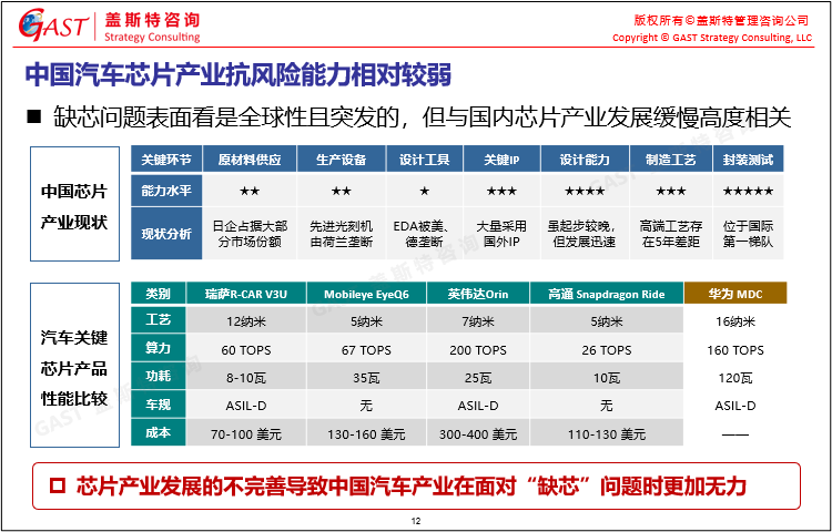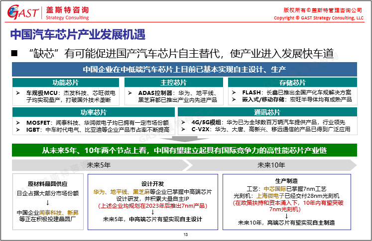 中國(guó)汽車(chē)芯片產(chǎn)業(yè)的挑戰(zhàn)與機(jī)遇:中國(guó)芯片產(chǎn)業(yè)發(fā)展的不完善使得抗風(fēng)險(xiǎn)能力相對(duì)較弱, 同時(shí),“缺芯”也有可能促進(jìn)國(guó)產(chǎn)汽車(chē)芯片自主替代,使產(chǎn)業(yè)進(jìn)入發(fā)展快車(chē)道。