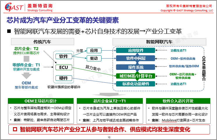 芯片成為汽車(chē)產(chǎn)業(yè)分工變革的關(guān)鍵要素:智能網(wǎng)聯(lián)汽車(chē)發(fā)展的需要+芯片自身技術(shù)的發(fā)展,使得智能網(wǎng)聯(lián)汽車(chē)芯片產(chǎn)業(yè)分工從參與者到合作、供應(yīng)模式均發(fā)生深度變化。