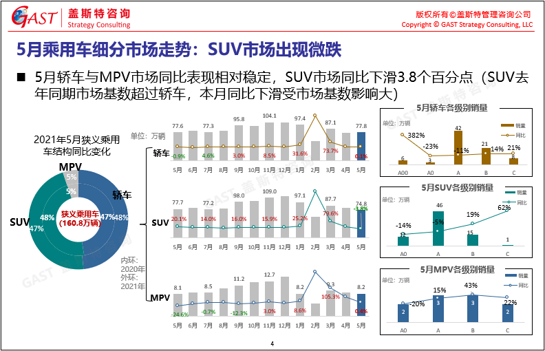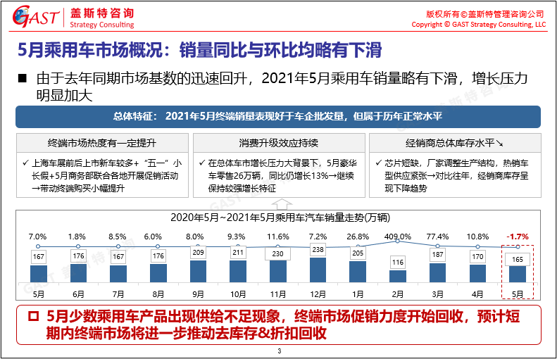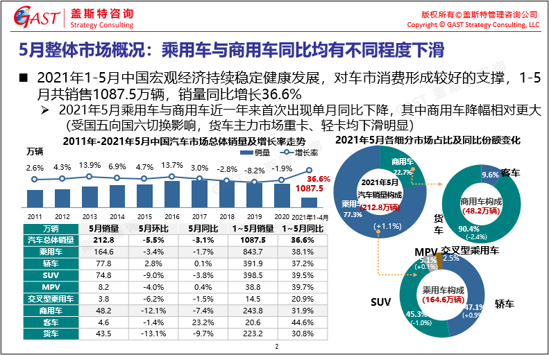 5月乘用車市場概況:由于去年同期市場基數(shù)的迅速回升,2021年5月乘用車銷量略有下滑,增長壓力明顯加大。