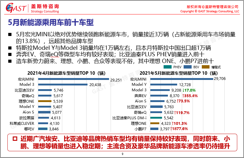5月新能源乘用車前十車型:5月宏光MINI以絕對優(yōu)勢繼續(xù)領(lǐng)跑新能源車市,銷量接近3萬輛,遠(yuǎn)超其他品牌車型;特斯拉Model Y與Model 3銷量均在1萬輛左右,且本月特斯拉中國出口超1萬輛。