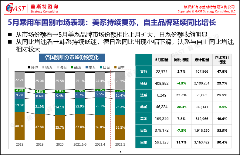 5月乘用車國別市場表現(xiàn):韓系持續(xù)低迷,同比下滑超過20%;德日系同比出現(xiàn)小幅下滑,法系與自主同比增速相對較大,均超過10%;美系本月市場份額占比超10%。