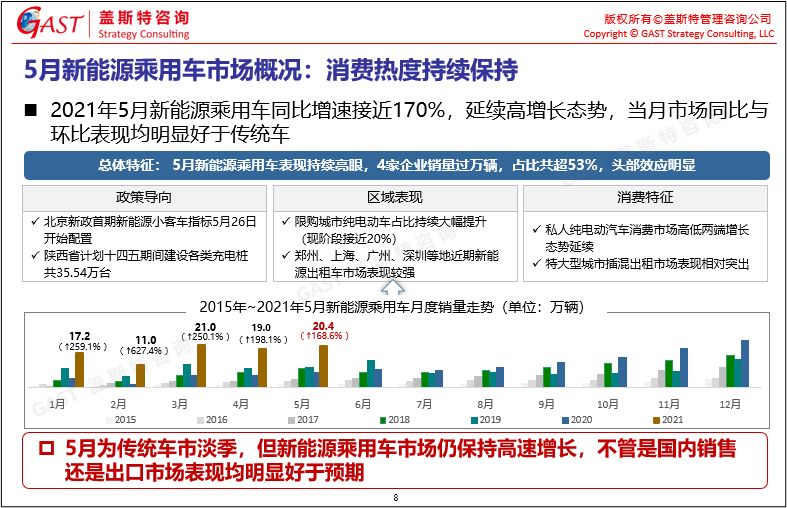 5月新能源乘用車市場概況:繼續(xù)保持高增長態(tài)勢,5月銷售新能源乘用車超20萬輛,達(dá)到20.4萬輛,同比增速達(dá)168.6%,增速大幅領(lǐng)先于傳統(tǒng)車;國內(nèi)銷售和出口市場表現(xiàn)均好于預(yù)期。