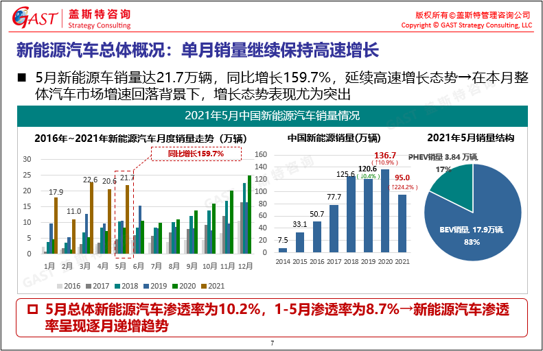 5月新能源汽車總體概況:5月新能源汽車銷量達(dá)21.7萬輛(同比增速達(dá)159.7%),新能源汽車滲透率達(dá)10.2%,1-5月總體滲透率為8.7%(2020年滲透率僅為5%),新能源汽車滲透率呈現(xiàn)逐月遞增趨勢。